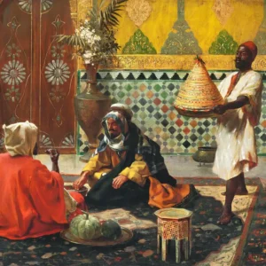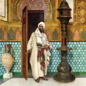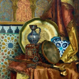• A Tambourine, Knife, Turkish Box, Turkish Jug, Moroccan Tile and Plate on a Satin Covered Table by Rudolf Ernst