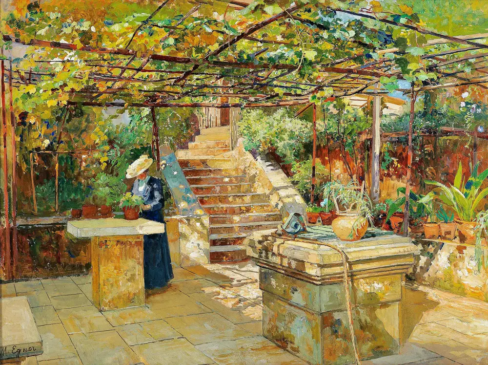 A flower lover on a sunny terrace by Marie Egner turns its named subject into the clear focal point of the composition. The title gives the work a distinct identity, helping it read as a specific image with its own mood rather than a generic decorative print. Egner’s work is prized for atmosphere, shifting light, and a deeply felt response to landscape. It also fits atmospheric impressionism, where light, weather, and tonal transition matter as much as clear contour. Presented here in our 3 x 4 fine art collection, it is designed to bring a more considered gallery feel to home or office walls.