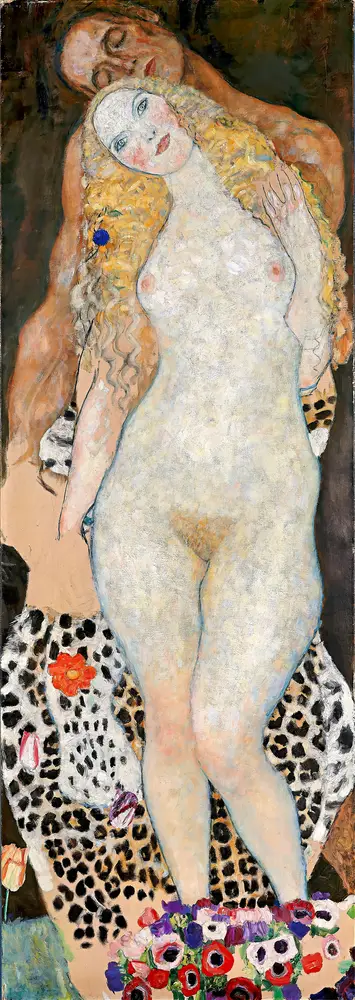 “Adam and Eve” by Gustav Klimt is a captivating example of early 20th-century Symbolism. Painted in 1917, it reflects Klimt’s fascination with myth, allegory, and the human form. Known for his decorative style and intricate patterns, Klimt often used rich gold leaf and detailed motifs to evoke a sense of mystery and sensuality in his work. This piece combines those elements with a profound exploration of human nature, innocence, and temptation.
