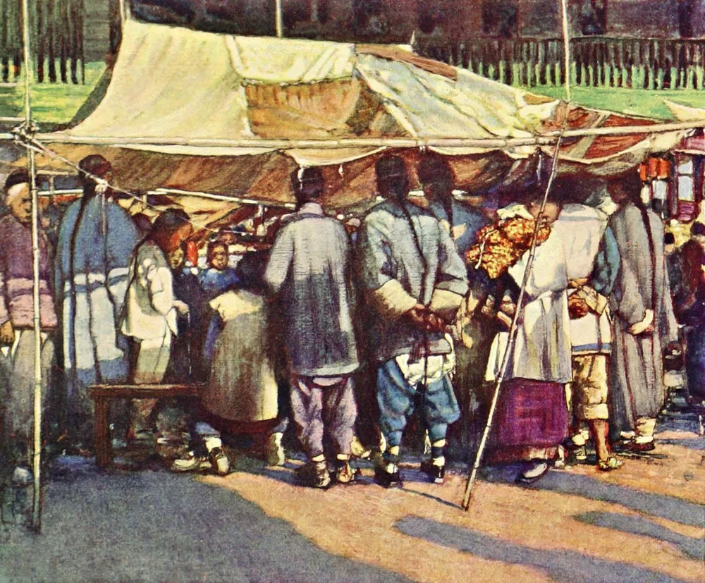 Menpes, Mortimer (1855-1938) – China 1909 – A street-stall by Mortimer Menpes is offered as an illustration fine art print from England in our 6 x 5 format. This piece brings classic gallery character to wall decor, with the artwork prepared for a refined canvas presentation.