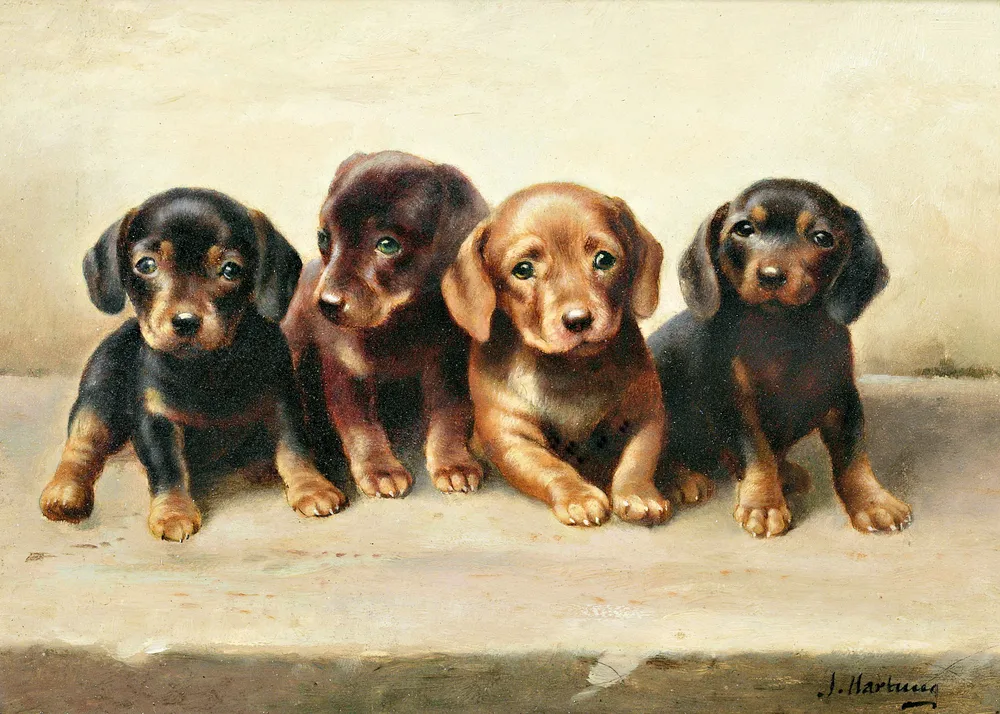 Four Dachshund puppies by Carl Reichert turns its named subject into the clear focal point of the composition. As the title suggests, the image focuses on four Dachshund puppies, turning an animal subject into something vivid, characterful, and immediately engaging. Reichert is especially admired for animal paintings that feel affectionate, theatrical, and sharply observed. That approach suits animal painting particularly well, because personality and movement are central to the image. Presented here in our 5 x 7 fine art collection, it is designed to bring a more considered gallery feel to home or office walls.