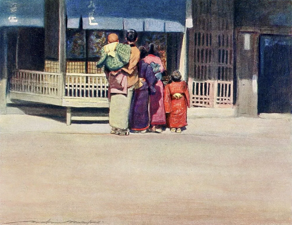 Menpes, Mortimer (1855-1938) – Japan 1901 – A family group by Mortimer Menpes is offered as an illustration fine art print from England in our 14 x 11 format. This piece brings classic gallery character to wall decor, with the artwork prepared for a refined canvas presentation.