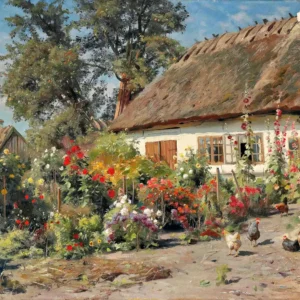 A Cottage Garden With Chickens (1919) by Peder Mørk Mønsted