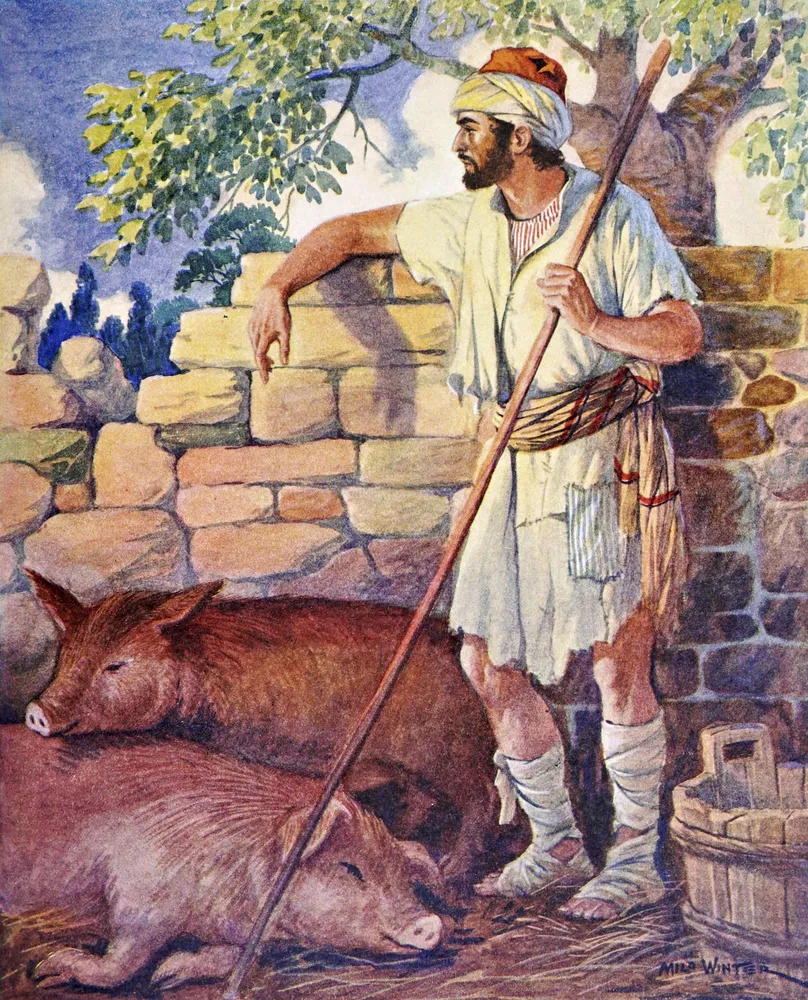 Winter, Milo (1888-1956) – Bible Stories 1925 – Swineherd thinking longingly by Milo Winter is offered as an illustration fine art print from England in our 11 x 14 format. This piece brings classic gallery character to wall decor, with the artwork prepared for a refined canvas presentation.