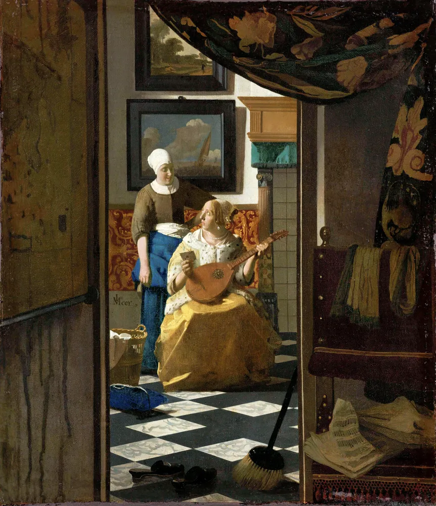 “The Love Letter,” painted around 1669 to 1670 by Johannes Vermeer, is a beautiful example of Dutch Baroque art. Vermeer, renowned for his masterful use of light and detail, captures a quiet, intimate moment that invites viewers into a private scene filled with delicacy and subtlety. This work showcases his skill in portraying everyday life with a sense of calm and grace.