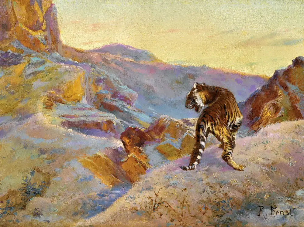 Tiger in the mountains by Rudolf Ernst turns its named subject into the clear focal point of the composition. The title gives the work a distinct identity, helping it read as a specific image with its own mood rather than a generic decorative print. Ernst is known for decorative detail, architectural richness, and scenes built around atmosphere and surface. That sensibility aligns naturally with Orientalist painting, where costume, texture, setting, and atmosphere all contribute to the effect. Presented here in our 3 x 4 fine art collection, it is designed to bring a more considered gallery feel to home or office walls.